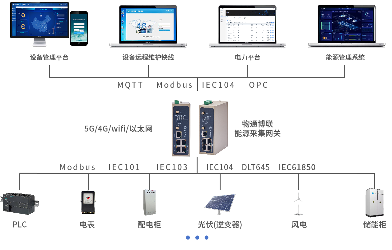 物通博聯(lián)能源采集網(wǎng)關可以連接水、電、氣、熱等能源設備和PLC,支持Modbus、IEC101、IEC103、IEC104、DLT645、IEC61850等協(xié)議,采集能源數(shù)據(jù)上傳到能源管理系統(tǒng)或數(shù)據(jù)中心進行分析和監(jiān)控,實時監(jiān)控各種能源設備的運行狀態(tài)和能源消耗情況,及時發(fā)現(xiàn)和解決能源浪費和設備故障等問題,提高能源管理效率。