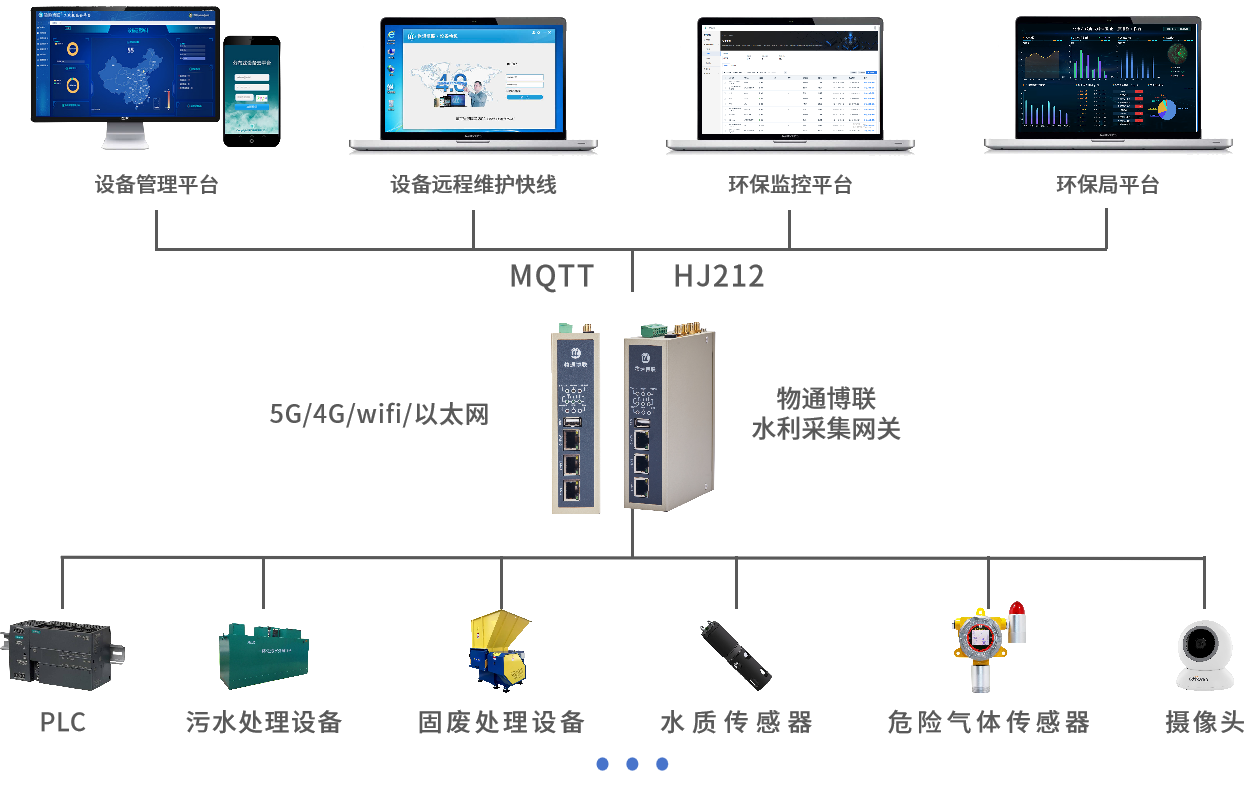 物通博聯環(huán)保采集網關可以連接各種環(huán)保設備、傳感器、儀表、IO數據和PLC,通過MQTT協(xié)議上傳到設備管理平臺和通過HJ212協(xié)議上傳到環(huán)保局監(jiān)控平臺,實現設備遠程監(jiān)控和數據分析,為環(huán)境監(jiān)測和管理提供重要的決策支持。