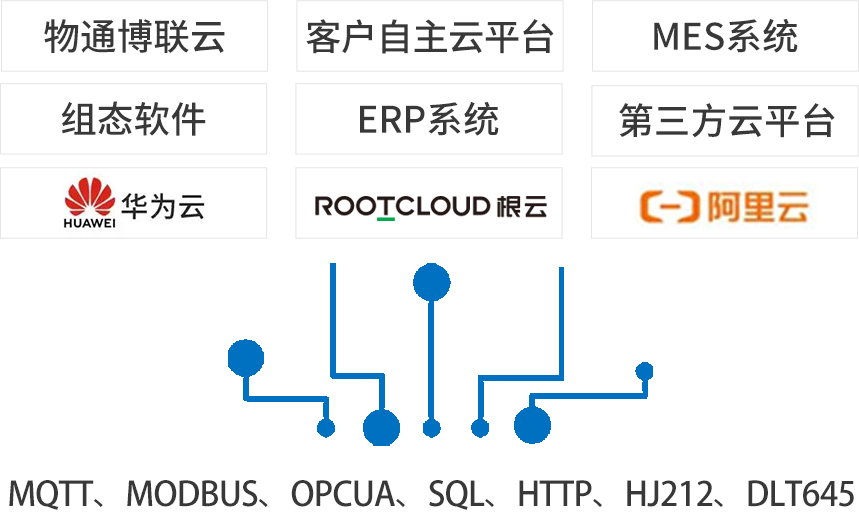 北向支持接入物通博聯(lián)云平臺,客戶自主開發(fā)的云平臺,第三方云平臺(根云、美云、華為、阿里、百度、微軟等IOT云平臺),組態(tài)軟件、MES系統(tǒng)、行業(yè)監(jiān)控平臺等工業(yè)軟件